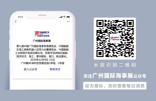 第九屆中國廣州國際海事貿(mào)易展覽會(huì)暨論壇(簡稱“廣州國際海事展”,INMEX China 2020)將于2020年12月9日-11日在廣州琶洲·保利世貿(mào)博覽館舉行,預(yù)計(jì)展覽總面積將達(dá)23,000平方米,匯集20多個(gè)國家和地區(qū)的800余家企業(yè)聯(lián)合參展,將由國際展區(qū)、船企展區(qū)、船用設(shè)備及先進(jìn)材料展區(qū)、船舶通導(dǎo)展區(qū)、郵輪產(chǎn)業(yè)展區(qū)、郵輪(客船)內(nèi)裝展區(qū)、海洋牧場展區(qū)、海上風(fēng)電展區(qū)、港口及航運(yùn)服務(wù)展區(qū)等九大展區(qū)組成,全面展示海事業(yè)上下游產(chǎn)業(yè)鏈的創(chuàng)新產(chǎn)品、技術(shù)和服務(wù)。