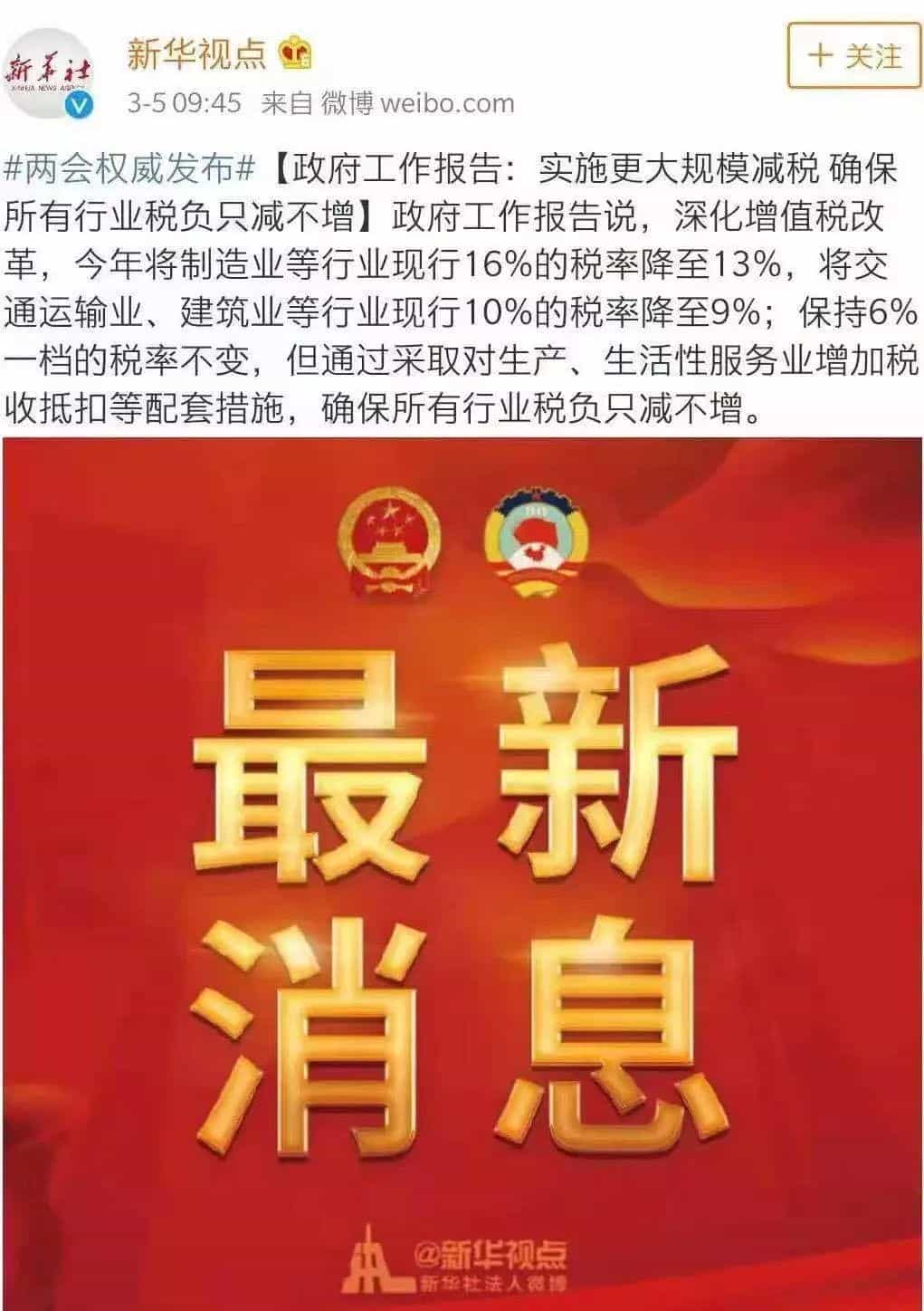 2、降低企業(yè)稅負(fù)。政府工作報告提出,2019年要實施更大規(guī)模的減稅,普惠性減稅與結(jié)構(gòu)性減稅并舉,重點降低制造業(yè)和小微企業(yè)稅收負(fù)擔(dān)。財經(jīng)專家認(rèn)為,其中的重頭戲是增值稅改革。此次調(diào)整后,將變?yōu)?3%、9%與6%三檔。而對于降低制造業(yè)增值稅,雖然此前一直呼吁不斷,但本次3個百分點的降幅遠(yuǎn)超預(yù)期。