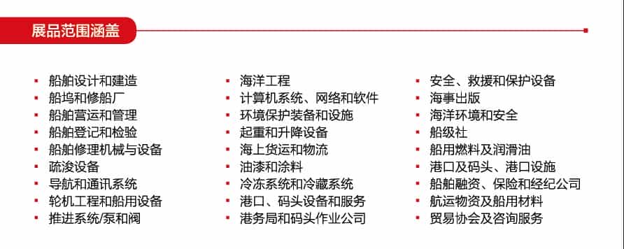 關(guān)鍵字延伸:船舶設(shè)計和建造、船塢和修船廠、船舶營運和管理、船舶登記和檢驗、船舶修理機械與設(shè)備、疏浚設(shè)備、導(dǎo)航和通訊系統(tǒng)、輪機工程和船用設(shè)備、推進(jìn)系統(tǒng)/泵和閥、海洋工程、計算機系統(tǒng)、網(wǎng)絡(luò)和軟件、環(huán)境保護(hù)裝備和設(shè)施、起重和升降設(shè)備、海上貨運和物流、油漆和涂料、冷凍系統(tǒng)和冷藏系統(tǒng)、港口,碼頭設(shè)備和服務(wù)、港務(wù)局和碼頭作業(yè)公司、安全,救援和保護(hù)設(shè)備、海事出版、海洋環(huán)境和安全、船級社、船用燃料及潤滑油、港口及碼頭,港口設(shè)備、船舶融資、保險和經(jīng)紀(jì)公司、船運物資及船用材料、貿(mào)易協(xié)會及咨詢服務(wù)