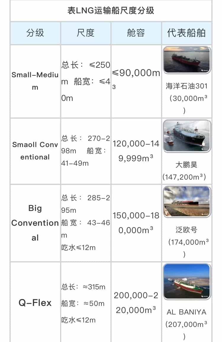 大部分商船如散貨船、油船都以載重噸計量船舶尺度,而LNG因低密度的特性(約為水的密度的一半),LNG運輸船則以載貨艙容立方米為單位計量船舶尺度。隨著造船技術(shù)的進(jìn)步和船東對規(guī)模效益的追求,現(xiàn)代商船的發(fā)展歷程總體呈大型化趨勢,LNG運輸船也不例外。