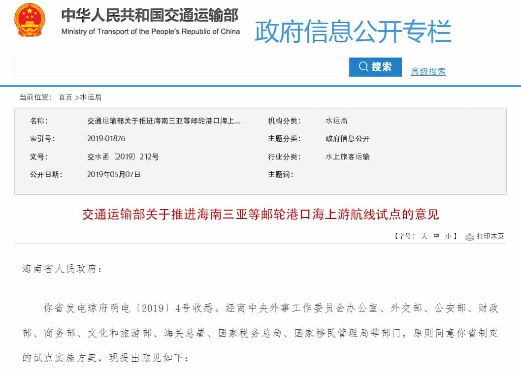 5月7日,交通運(yùn)輸部發(fā)布《關(guān)于推進(jìn)海南三亞等郵輪港口海上游航線試點(diǎn)的意見》。