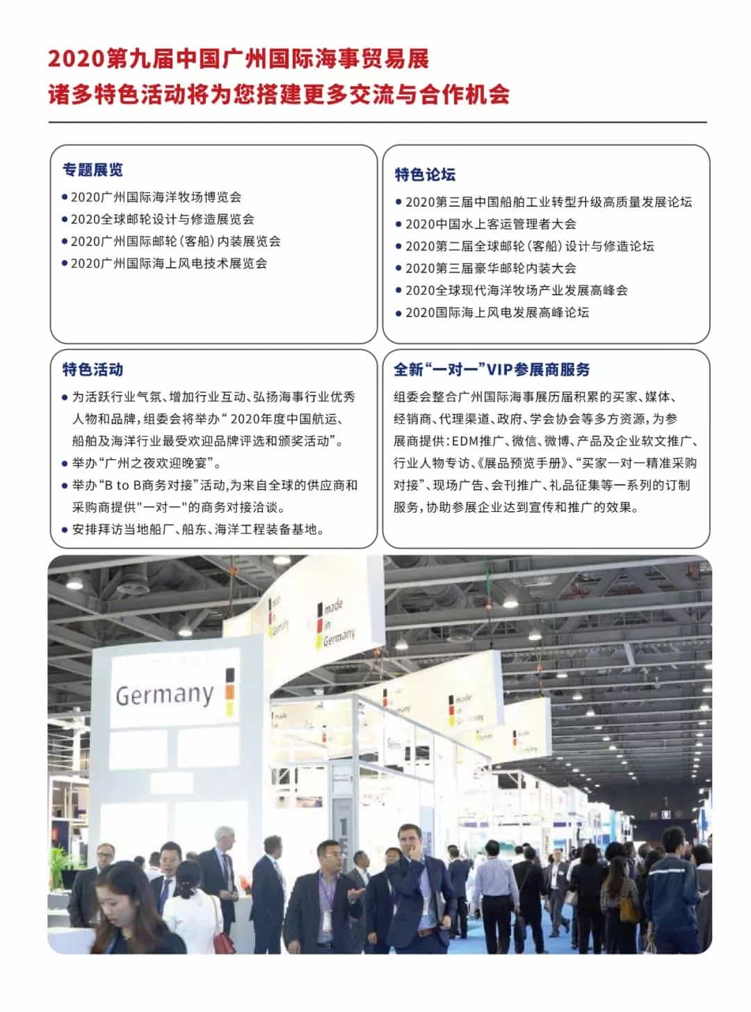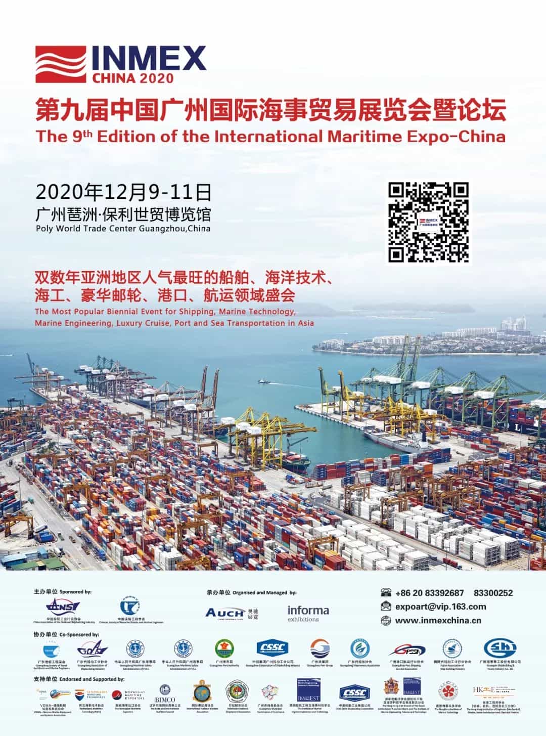第九屆中國廣州國際海事貿易展覽會暨論壇(簡稱:廣州國際海事展 INMEX China 2020)將于2020年12月9日-11日在廣州琶洲·保利世貿博覽館舉行,預計展覽總面積達23,000平方米,將匯聚20多個國家和地區(qū)的800余家企業(yè)聯(lián)合參展。