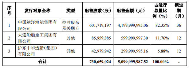 其中,作為中遠(yuǎn)海能的間接控股股東和關(guān)聯(lián)方,中遠(yuǎn)海運(yùn)集團(tuán)本次參與認(rèn)購的股票數(shù)量約為6億股,占發(fā)行總量的82.35%,認(rèn)購金額約為42億元。大船集團(tuán)參與認(rèn)購的股票數(shù)量約為8596萬股,占發(fā)行總量的11.76%,認(rèn)購總金額約為6億元。滬東中華參與認(rèn)購股票數(shù)量約為4298萬股,占發(fā)行總量的5.88%,認(rèn)購總金額約為3億元。