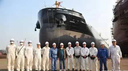 4月9日,新?lián)P子造船為保加利亞國(guó)航建造的第五艘45000DWT散貨船在船臺(tái)東線順利下水。