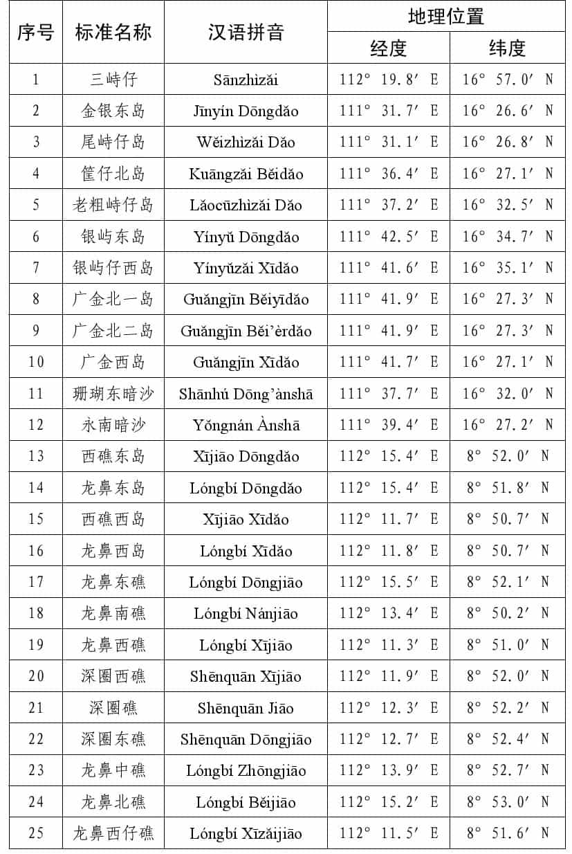 公告稱,為進(jìn)一步規(guī)范有關(guān)地名的使用,現(xiàn)將我國南海部分島礁和海底地理實體的標(biāo)準(zhǔn)名稱予以公布。中國地名委員會1983年4月受權(quán)公布的《我國南海諸島部分標(biāo)準(zhǔn)地名》繼續(xù)有效,請社會各界規(guī)范使用已公布的標(biāo)準(zhǔn)名稱。