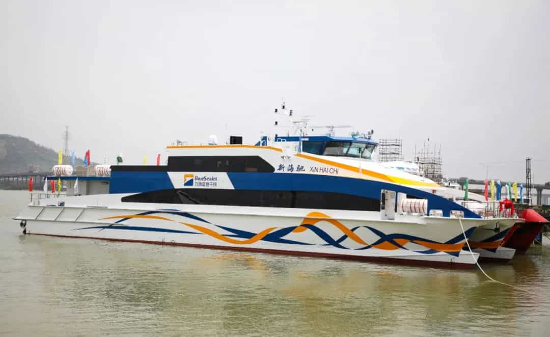 “新海馳”號是繼“新海威”號、“新海亮”號后,澳龍船艇與珠海九洲藍色干線的再度攜手,該船采用全鋁合金材料,總長42.1米,型寬10.6米,設計航速36節(jié),客位數(shù)238人。采用了澳大利亞Austal全球領先的設計和工藝,在“新海威”號的基礎上,根據(jù)海上水域特點與客戶需求進行深度優(yōu)化,達到更舒適性、經濟性、安全性的最優(yōu)平衡。