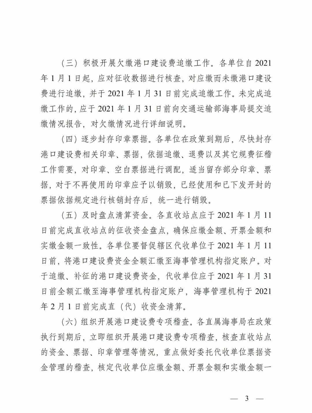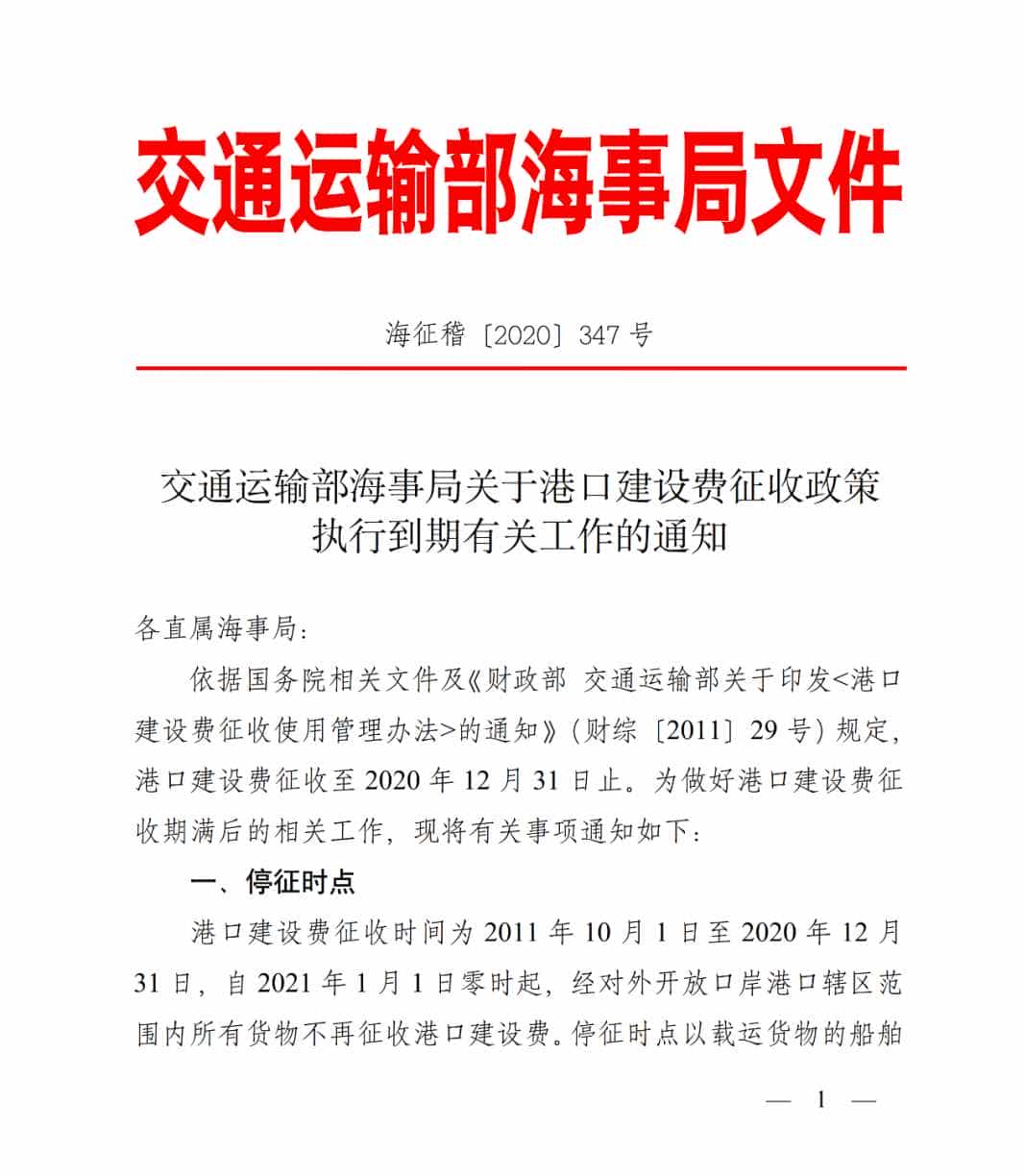 港口建設(shè)費(fèi)征收時(shí)間為2011年10月1日至2020年12月31日,自2021年1月1日零時(shí)起,經(jīng)對外開放口岸港口轄區(qū)范圍內(nèi)所有貨物不再征收港口建設(shè)費(fèi)。