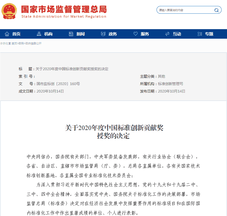 “中國標準創(chuàng)新貢獻獎”是由國家市場監(jiān)督管理總局(國家標準化管理委員會)設(shè)立的獎項,是我國標準化領(lǐng)域的最高榮譽。