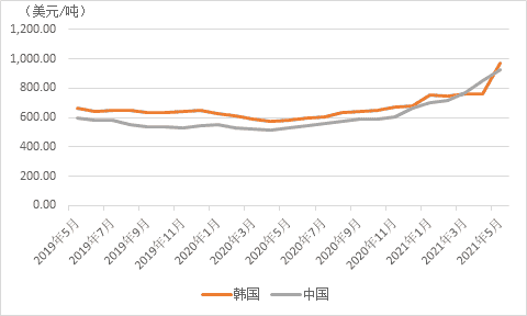 從6月份數(shù)據(jù)來看,造船板價(jià)格基本圍繞在6200元/噸的高位徘徊。此外,韓國船用鋼板價(jià)格也在快速上升,以市價(jià)計(jì),5月韓國船用鋼板以人民幣計(jì)從4870元/噸跳升至6182元/噸。