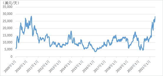 干散貨運(yùn)市場也在全球基礎(chǔ)設(shè)施建設(shè)、原材料需求旺盛等因素推動(dòng)下快速走高。同期,波羅的海干散貨指數(shù)(BDI)已升至3126點(diǎn),同比增長81.3%;散貨船綜合運(yùn)費(fèi)收益攀升至28416美元/天,達(dá)到2008年金融危機(jī)后的最高值。