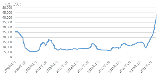 受疫情反復(fù)影響,全球制造業(yè)復(fù)工復(fù)產(chǎn)不均,港口擁堵及“集裝箱只出不進(jìn)”等因素導(dǎo)致船隊(duì)效率下降,市場“一箱難求”大幅推高運(yùn)費(fèi)收益。截至發(fā)稿日,箱船國際運(yùn)費(fèi)價(jià)格“直線”拉升,達(dá)到42969美元/天,同比增長3.6倍,連續(xù)打破歷史紀(jì)錄。