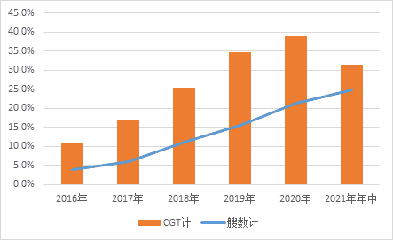 此外,市場向綠色船舶傾斜的速度加快,以雙燃料動(dòng)力為主的環(huán)保船舶占新承接訂單比例不斷升高。以成交的艘數(shù)計(jì),2016年僅占新船訂單的3.9%,而2020年就已升到21.3%,到今年年中占比進(jìn)一步擴(kuò)大,接近四分之一(24.9%);以修正總噸計(jì),2020年環(huán)保船舶占總訂單的比例接近38.9%。