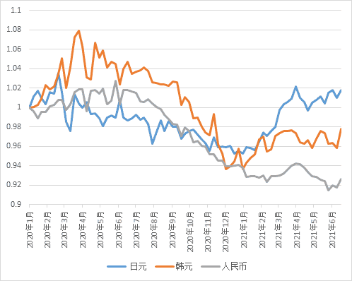 從2020年至今中日韓三國貨幣兌美元匯率變化看,人民幣和韓國都先經(jīng)歷貶值再升值,截至發(fā)稿日比2020年初分別升值7%和4%;日元是先升值再貶值,基本與2020年初持平。人民幣匯率快速升值既加大企業(yè)的經(jīng)營風(fēng)險(xiǎn),又一定程度上影響中國企業(yè)相較于競爭者的國際競爭力。