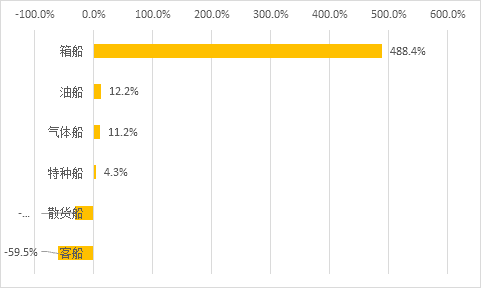 其中,箱船占比高達(dá)51.3%(以CGT計(jì))。從“5+1”六大船型(油散集氣客+特種船)累積成交量與2019-2020兩年同期成交均值對比來看,箱船增加4.9倍,油船、氣體船增加一成左右,特種船小幅增加,散貨船和客船降幅較大。
