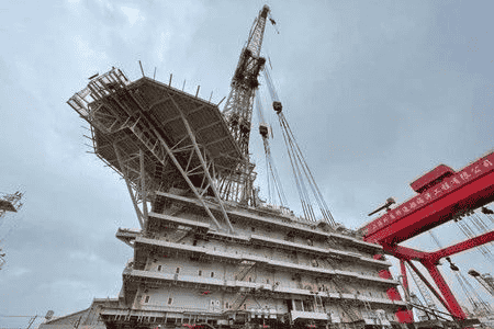 一是體量大,整個上層建筑長60米、寬15米,面積相當于2個標準籃球場;總高度達到52米,相當于17層樓高;重量近2800噸,較1號、2號船分別增加了300噸和460噸,成為中國第一“上層建筑”。