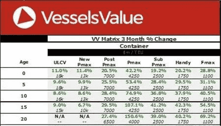 VesselsValue統(tǒng)計(jì)今年3-5月集裝船船價(jià)值變化情況