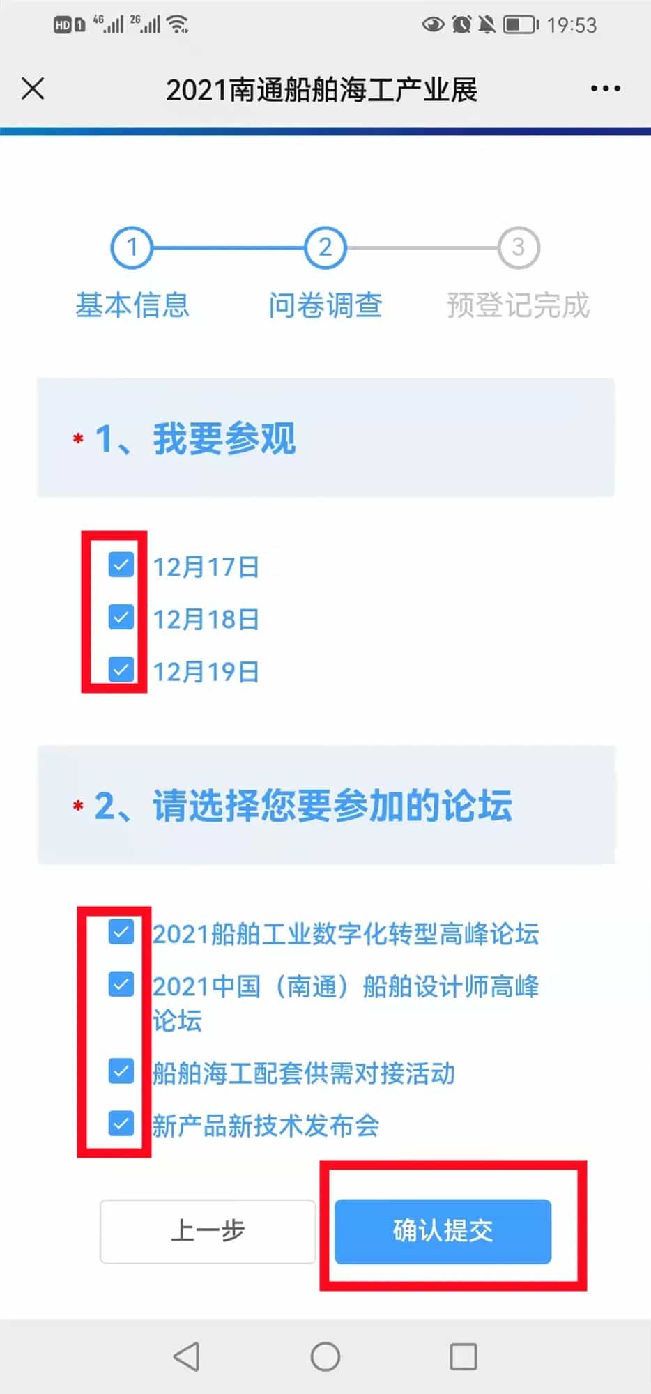 ★ 第四步:進(jìn)入問(wèn)卷調(diào)查頁(yè)面,選擇要參觀的日期、論壇(可多選)后,點(diǎn)擊“確認(rèn)提交”。