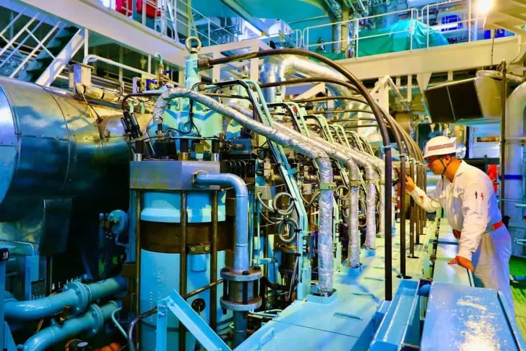該型發(fā)動機額定功率達(dá)5844千瓦,而缸徑只有400毫米,是目前全世界性能指標(biāo)最高的雙燃料船用發(fā)動機,其電控系統(tǒng)、增壓器以及油霧探測器等關(guān)重件均為自主研制,國產(chǎn)化率超80%。相較常規(guī)柴油機,該型發(fā)動機在LNG模式下可降低99%的硫氧化物、90%的氮氧化物、99%的顆粒物以及18%的溫室氣體排放。