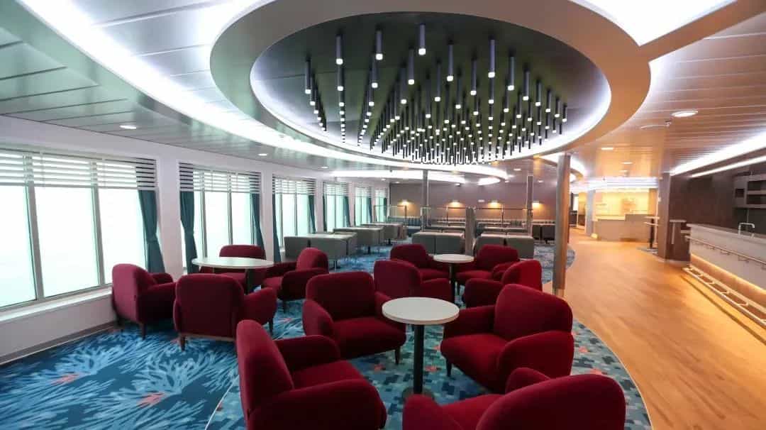 該船集眾多船舶制造領(lǐng)域的前沿科技于一身,綜合性能達(dá)到世界領(lǐng)先水平。在舒適性方面,該船振動(dòng)噪音滿足LR乘客和船員居住舒適性(PCAC)二級(jí)標(biāo)準(zhǔn)要求。該船全速前進(jìn)時(shí),旅客在上層建筑幾乎聽不見任何發(fā)動(dòng)機(jī)噪聲,大部分客房在船舶正常航行時(shí)噪音只有30多分貝,能給乘客帶來安靜舒適的乘坐體驗(yàn)。該船車道總長達(dá)4500米,可容納約271輛卡車,并配備半自動(dòng)化綁扎裝置,可實(shí)現(xiàn)大型拖車即停即走,省去了繁瑣的綁扎工作。