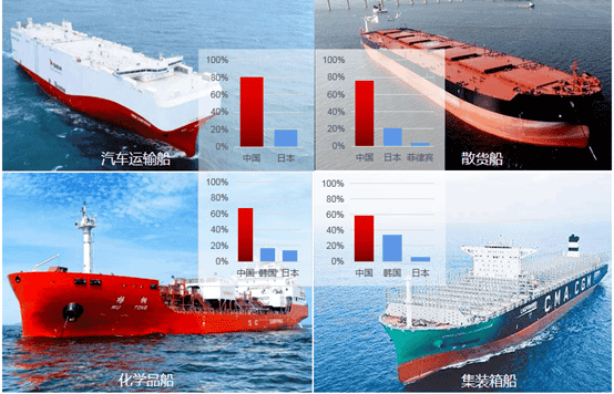 除在總量上繼續(xù)保持領(lǐng)先外,中國造船企業(yè)在各細(xì)分船型市場(chǎng)上持續(xù)發(fā)力,18個(gè)主要船型中,中國獲得10個(gè)船型的市場(chǎng)份額第一,其中在集裝箱船、散貨船、化學(xué)品船、多用途船(MPP)、海工船、汽車運(yùn)輸船(PCC/PCTC)等船型的市場(chǎng)份額超過50%(絕對(duì)優(yōu)勢(shì)),產(chǎn)品結(jié)構(gòu)大幅優(yōu)化,高技術(shù)、高附加值主力船型不斷涌現(xiàn)。