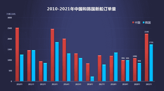 2021年,中韓造船業(yè)的搶單大戰(zhàn)終于塵埃落定。曾經(jīng)在上半年訂單量一路領(lǐng)先的韓國船企在最后時(shí)刻“放慢腳步”最終被中國反超。而在連續(xù)三年落后韓國之后,中國船企終于奪回世界第一寶座。