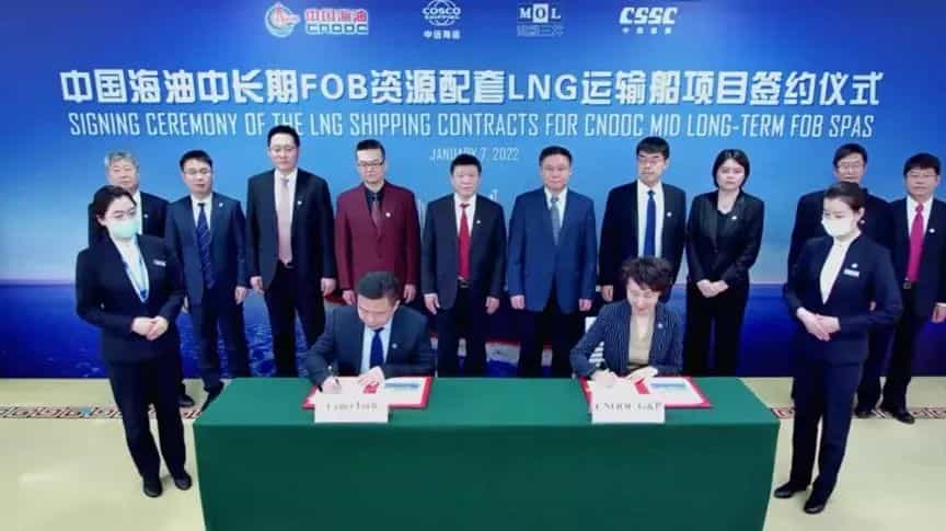 1月7日,“中海油中長期FOB資源配套LNG運(yùn)輸船項(xiàng)目”簽約儀式在北京、上海和日本東京以視頻連線方式舉行。中國船舶集團(tuán)有限公司旗下滬東中華造船(集團(tuán))有限公司和中國船舶工業(yè)貿(mào)易有限公司作為聯(lián)合賣方,與買方日本商船三井株式會社通過“云簽約”方式,正式簽訂6艘全球最新一代“長恒系列”17.4萬立方米液化天然氣(LNG)運(yùn)輸船建造合同,金額約75億元人民幣。