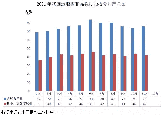 2021年我國造船板和高強(qiáng)度船板分月產(chǎn)量圖