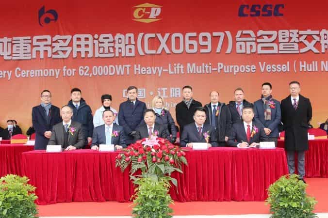 近日,中國船舶集團旗下中船澄西船舶修造有限公司2號62000噸重吊多用途船“赫貝特(HERBERT)”輪簽字交付。這是目前世界載重噸位最大多用途重吊船,比原計劃提前42天交付,這也是中船澄西2022年交付的第2艘新造船。