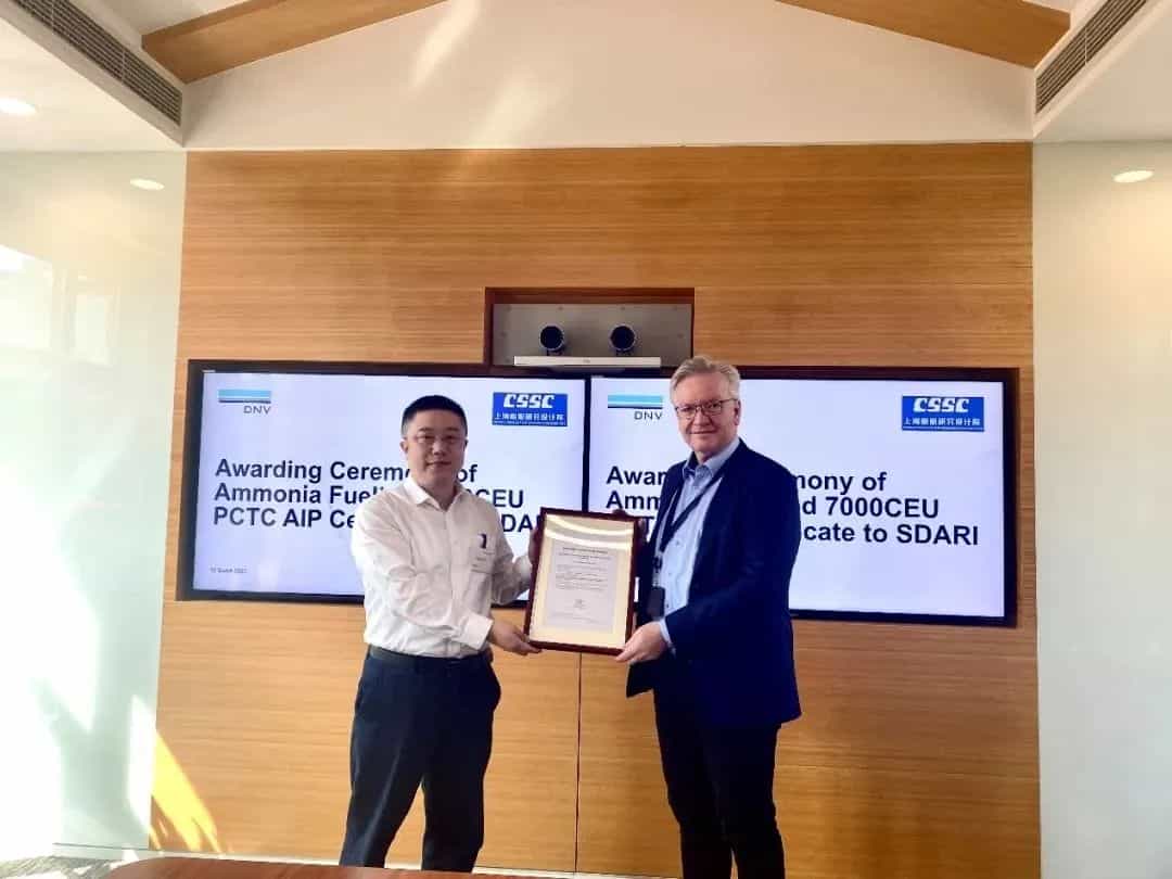 日前,由中國(guó)船舶集團(tuán)有限公司旗下上海船舶研究設(shè)計(jì)院自主研發(fā)設(shè)計(jì)的中國(guó)首創(chuàng)首款氨燃料動(dòng)力7000車位汽車運(yùn)輸船(PCTC)正式獲得DNV頒發(fā)的原則性認(rèn)可(AiP)證書(shū)。