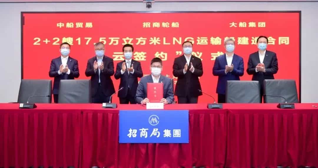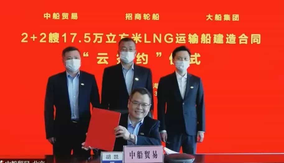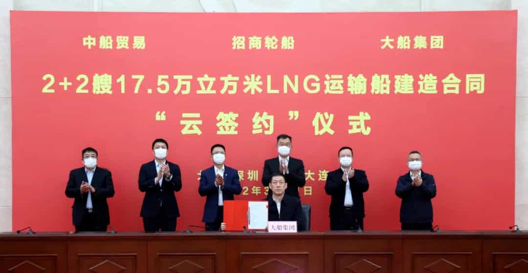 3月31日,中國船舶集團有限公司旗下大連船舶重工集團有限公司聯(lián)合中國船舶工業(yè)貿(mào)易有限公司,與招商局集團有限公司旗下招商局能源運輸股份有限公司在上海、深圳、大連及北京四地以“云簽約”方式正式簽署2+2艘17.5萬立方米大型液化天然氣(LNG)運輸船建造合同。