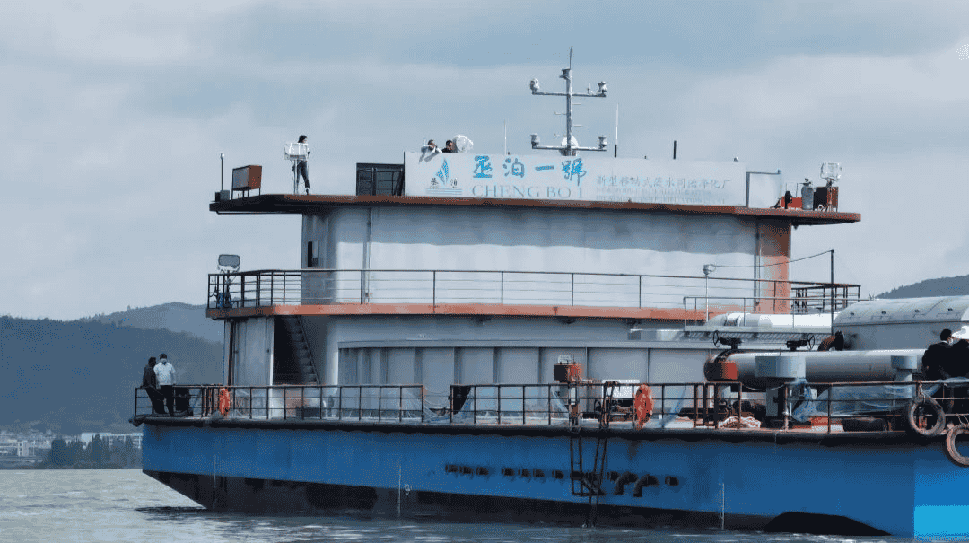 “丞泊一號”總長49.9米,型寬20米,是滇池最大的入級船舶。據(jù)了解,該船采用納米級的微氣泡對藍(lán)藻進行氣浮處理,每天可打撈處理藍(lán)藻水3-4萬噸,藍(lán)藻去除率可達(dá)95%以上。
