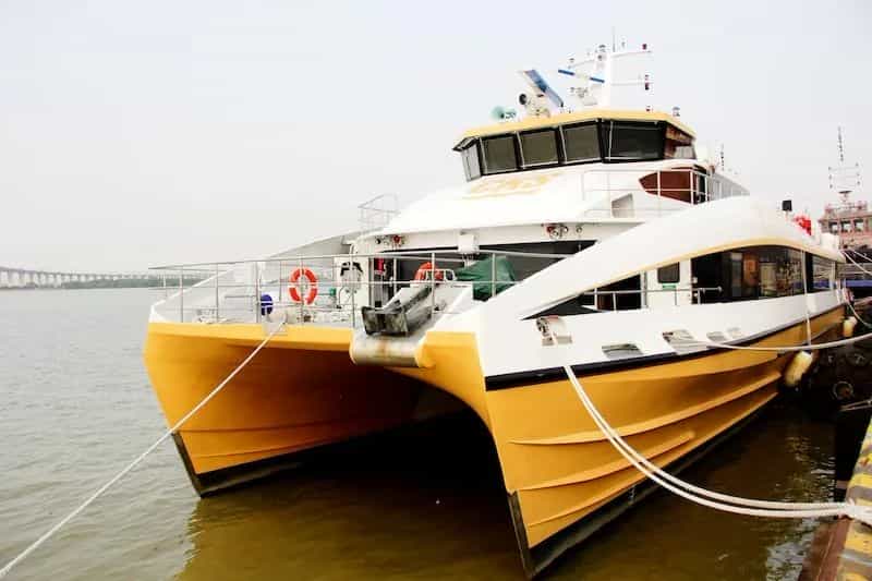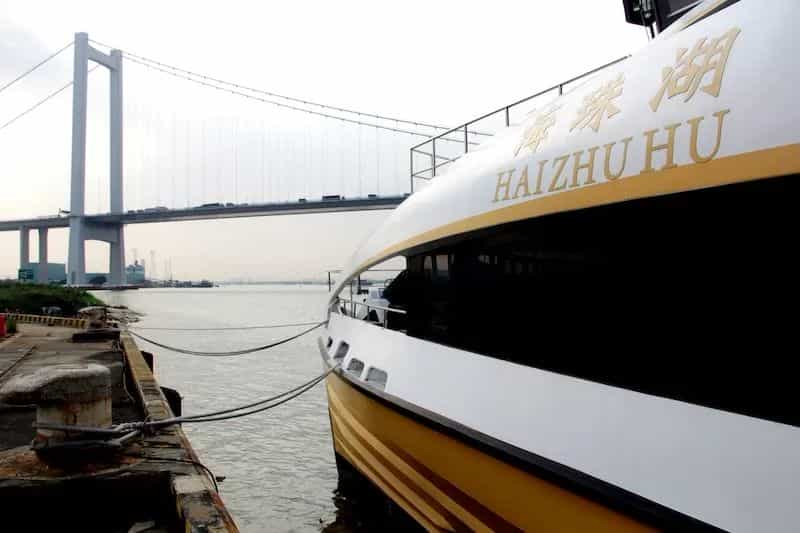 珠江船務(wù)旗下廣東中威復(fù)合材料有限公司船廠的碼頭上,停泊著兩艘已經(jīng)造好的客船“海珠灣”號(hào)與“海珠湖”號(hào)。不久后,它們將是琶洲港澳客運(yùn)碼頭一期投入使用的碳纖維高速客船,將以海天聯(lián)運(yùn)的方式,約120分鐘可完成從琶洲至香港國(guó)際機(jī)場(chǎng)直達(dá)。碳纖維高速客船采用噴水式推進(jìn),航速超過(guò)37節(jié),遠(yuǎn)遠(yuǎn)快于一般客船25節(jié)左右的航速。