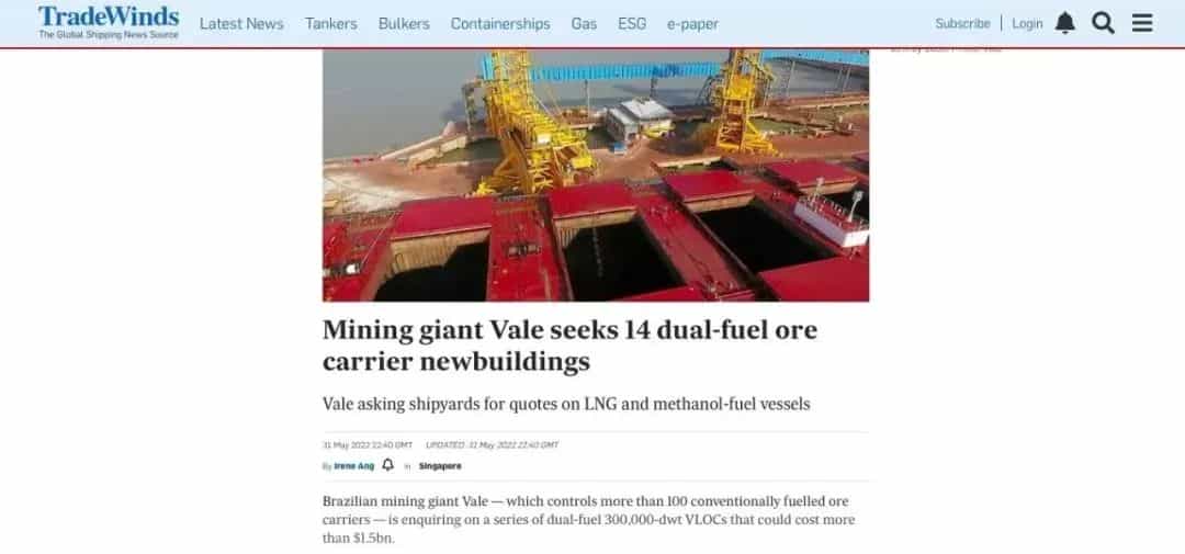 巴西礦業(yè)巨頭--淡水河谷計(jì)劃建造全球首批30萬(wàn)噸級(jí)雙燃料超大型礦砂船(VLOC),這份價(jià)值超過(guò)120億元人民幣的散貨船大單,有望全部交由中國(guó)船廠建造。