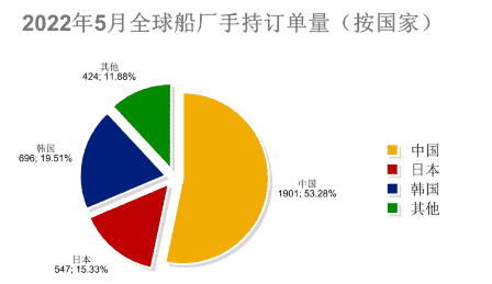 其中中國(guó)船廠手持訂單量為1901艘,艘數(shù)占全球市場(chǎng)份額的53.28%;日本船廠的手持訂單量為547艘,艘數(shù)占全球市場(chǎng)份額的15.33%;韓國(guó)船廠的手持訂單量為696艘,艘數(shù)占全球市場(chǎng)份額的19.51%。
