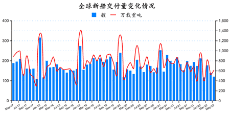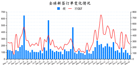 與2022年4月份相比較,數(shù)量環(huán)比減少32艘,修正總噸環(huán)比下降16.48%。