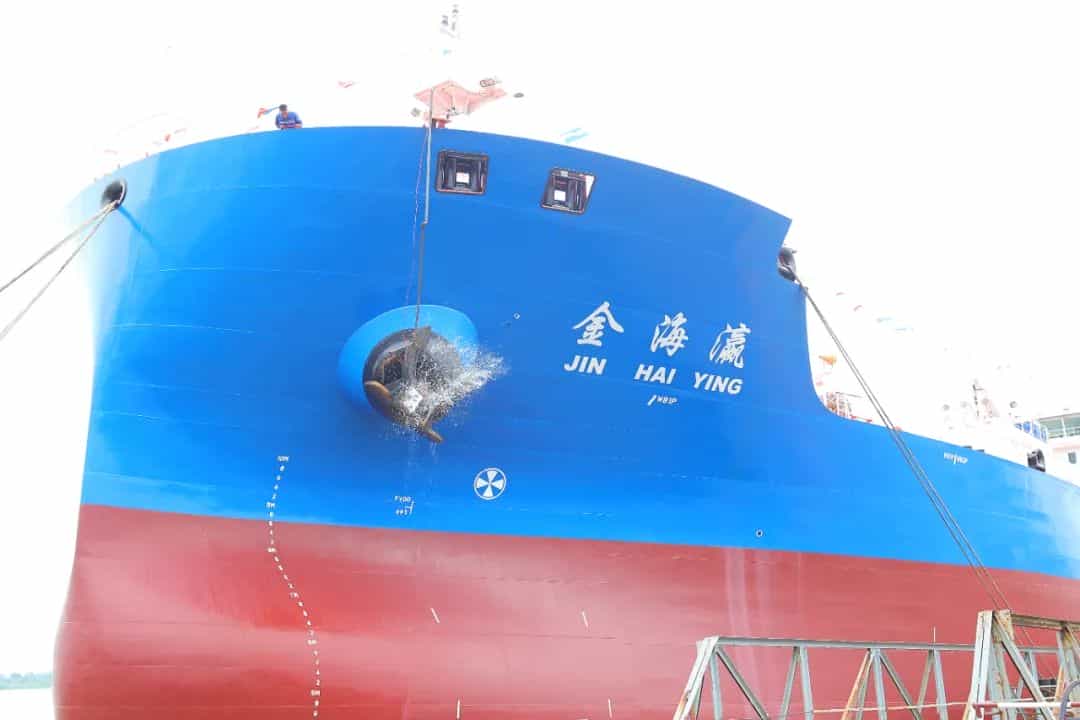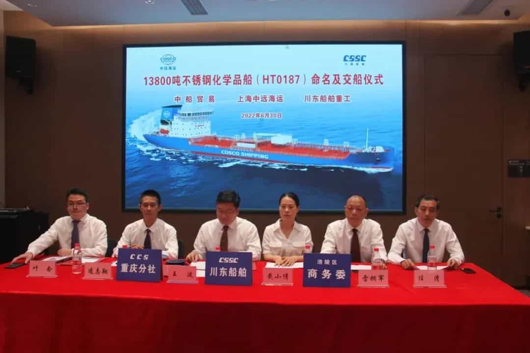 日前,重慶川東船舶重工有限責(zé)任公司聯(lián)合中國(guó)船舶貿(mào)易工業(yè)有限公司,為中遠(yuǎn)海運(yùn)(上海)有限公司建造的--13800噸不銹鋼化學(xué)品船項(xiàng)目首制船“金海瀛”號(hào)命名交付。