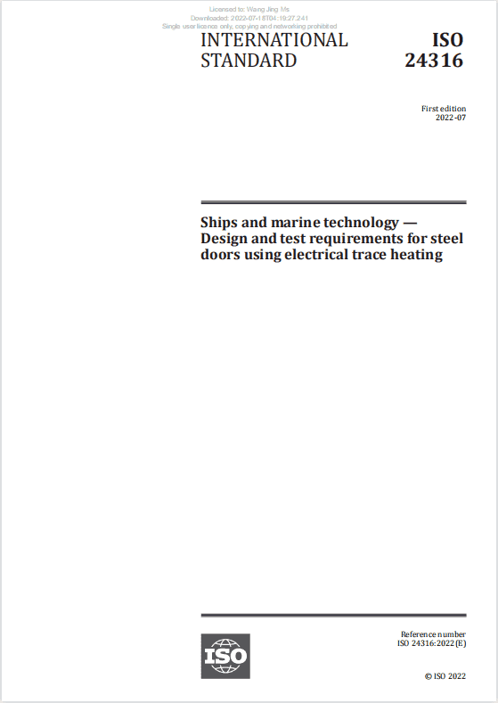 ISO 24319:2022《船舶與海上技術(shù) 船用電伴熱鋼質(zhì)小艙口蓋的設(shè)計與試驗要求》,由無錫德林防務(wù)裝備股份有限公司、中國船舶工業(yè)綜合技術(shù)經(jīng)濟研究院、江南造船(集團)有限責任公司、廣船國際有限公司、滬東中華造船(集團)有限公司聯(lián)合編制。
