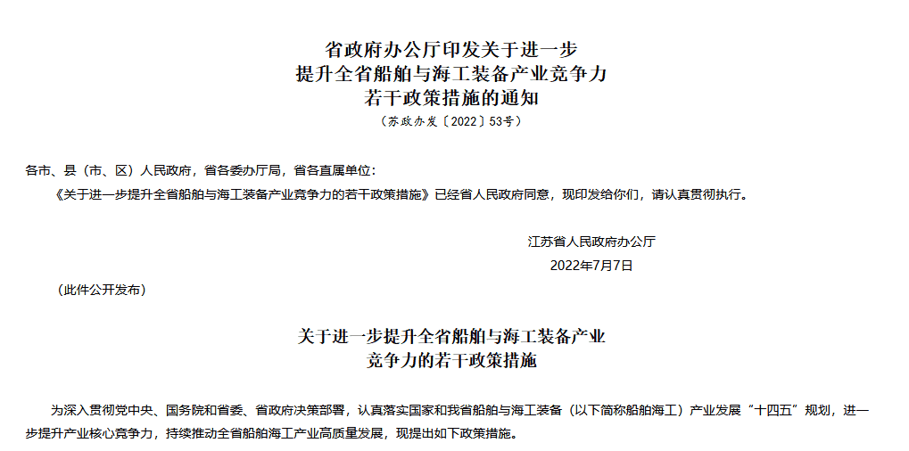 近日,江蘇省人民政府官網(wǎng)正式發(fā)布《關(guān)于進(jìn)一步提升全省船舶與海工裝備產(chǎn)業(yè)競(jìng)爭(zhēng)力的若干政策措施》(簡(jiǎn)稱政策措施)。