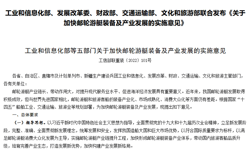 8月18日,工業(yè)和信息化部、國(guó)家發(fā)展和改革委員會(huì)、財(cái)政部、交通運(yùn)輸部、文化和旅游部聯(lián)合發(fā)布《關(guān)于加快郵輪游艇裝備及產(chǎn)業(yè)發(fā)展的實(shí)施意見》(簡(jiǎn)稱實(shí)施意見)。