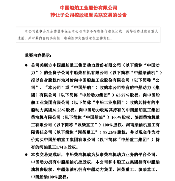 公告顯示,中國動力全資子公司中船柴油機,將以自身股權(quán)作為對價,向中國動力、中船工業(yè)集團、中船重工集團及中國船舶,開展柴油機動力業(yè)務收購,總交易對價達到226.3億元。