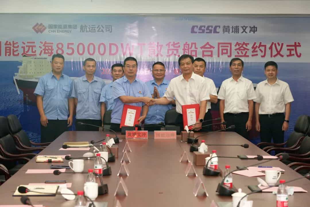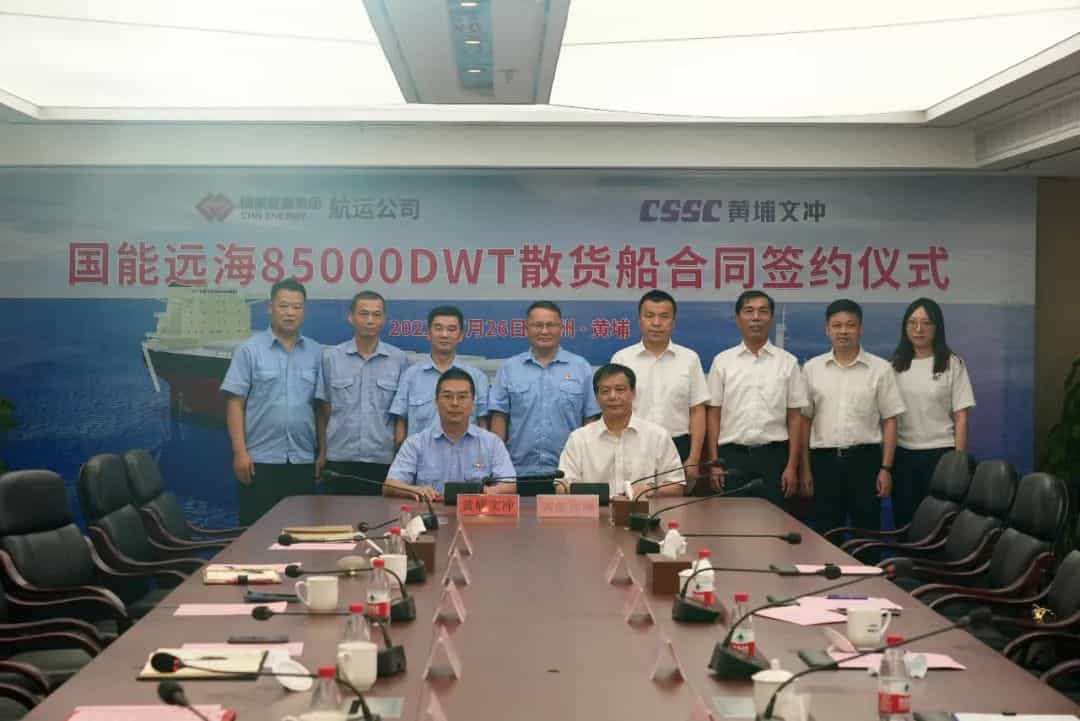 近日,中國船舶集團旗下黃埔文沖公司和國能遠海航運有限公司,舉行兩艘“海鯨”85000DWT散貨船建造合同簽約儀式。