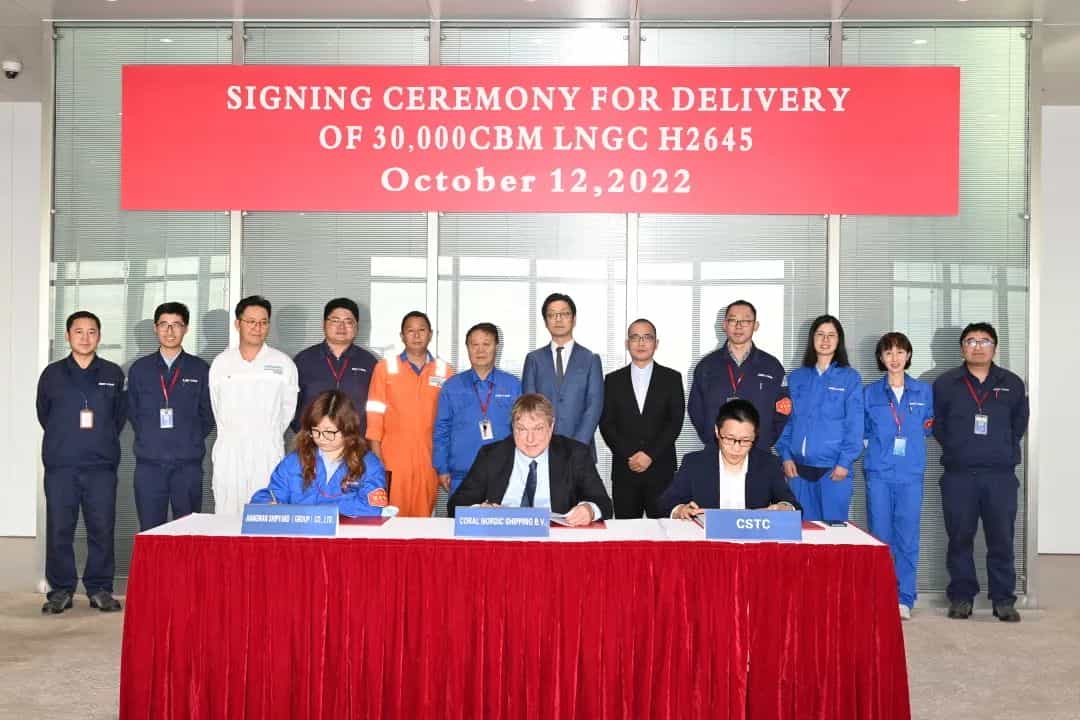 10月12日,江南造船(集團)有限責任公司為荷蘭船東Anthony Veder公司設計、建造的30000立方米液化天然氣(LNG)運輸船“Coral Nordic”號,在上海簽字交付。