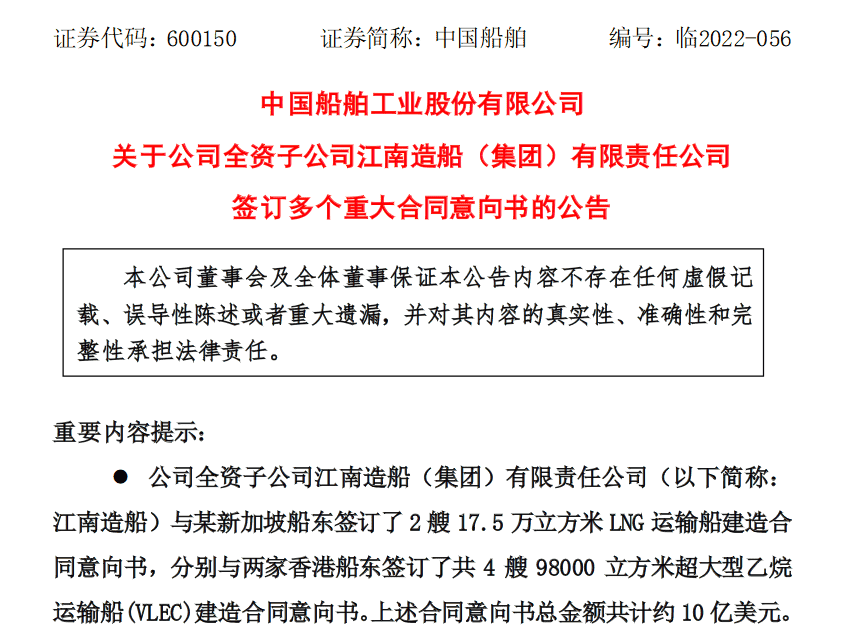 10月25日,中國船舶工業(yè)股份有限公司發(fā)布《關(guān)于公司全資子公司江南造船(集團)有限責任公司簽訂多個重大合同意向書》的公告。