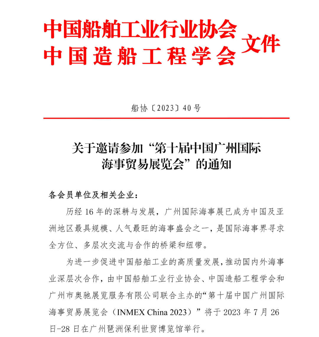 為進(jìn)一步促進(jìn)中國船舶工業(yè)的高質(zhì)量發(fā)展,推動國內(nèi)外海事業(yè)深層次合作,由中國船舶工業(yè)行業(yè)協(xié)會、中國造船工程學(xué)會和廣州市奧馳展覽服務(wù)有限公司聯(lián)合主辦的“第十屆中國廣州國際海事貿(mào)易展覽會(INMEX China 2023)”,將于2023年7月26-28日,在廣州琶洲保利世貿(mào)博覽館一樓2號館舉行。
