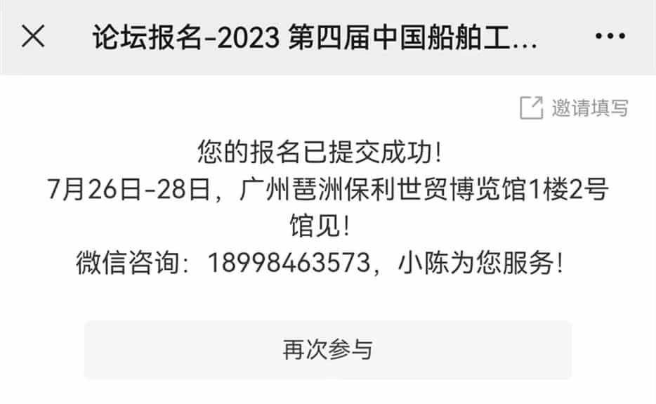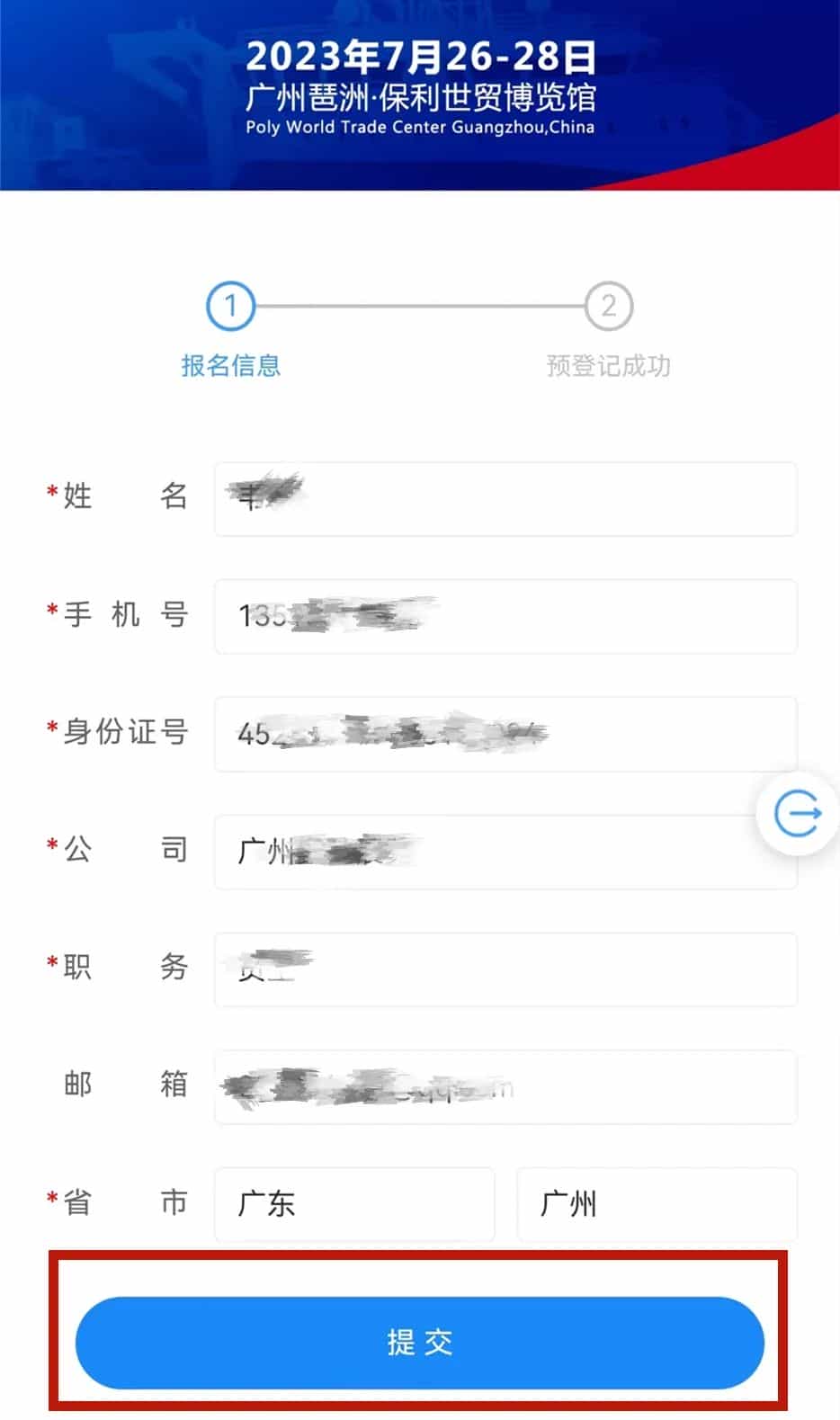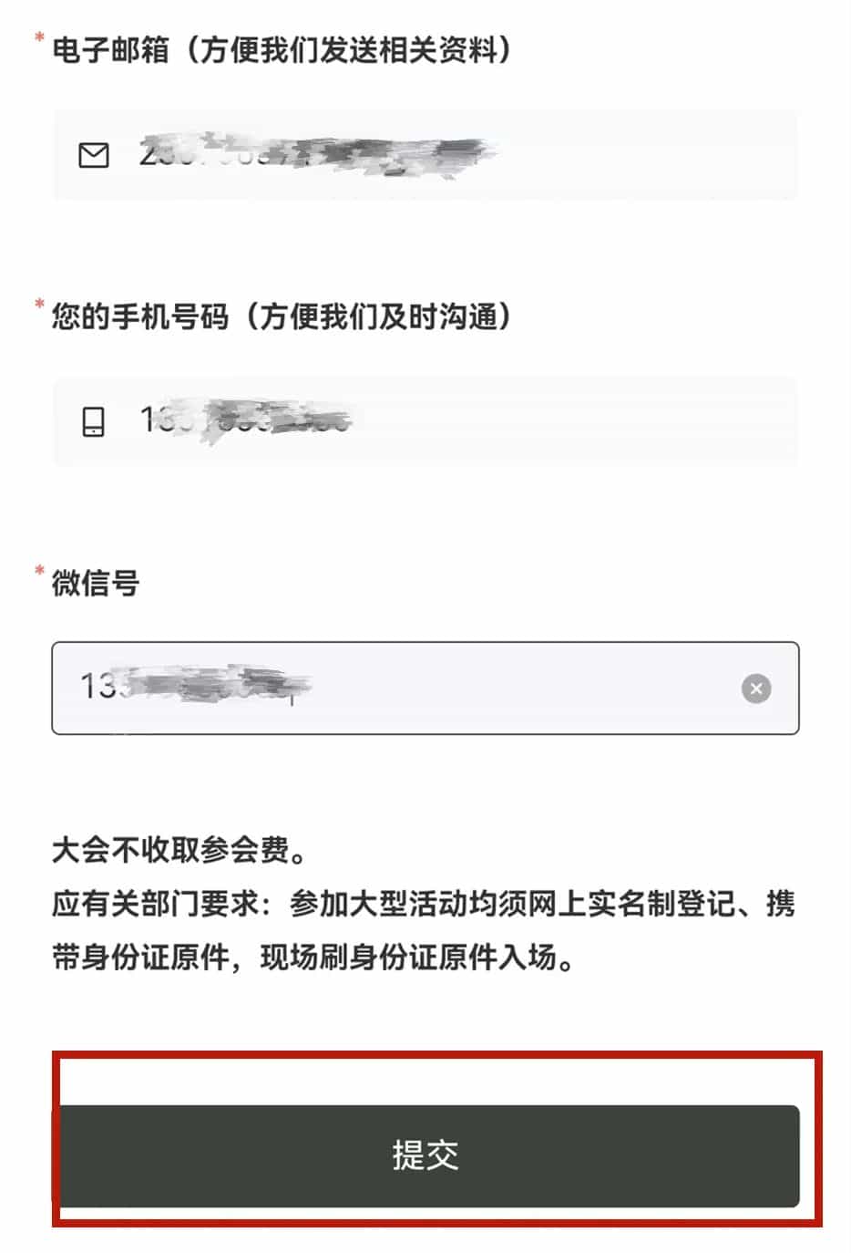1、掃描上方參觀登記二維碼,進(jìn)入登記頁面。請(qǐng)仔細(xì)閱讀頁面內(nèi)容,按要求填寫姓名、身份證號(hào)、公司、職務(wù)、電子郵箱、手機(jī)號(hào)、微信號(hào)等信息,并點(diǎn)擊“提交”。