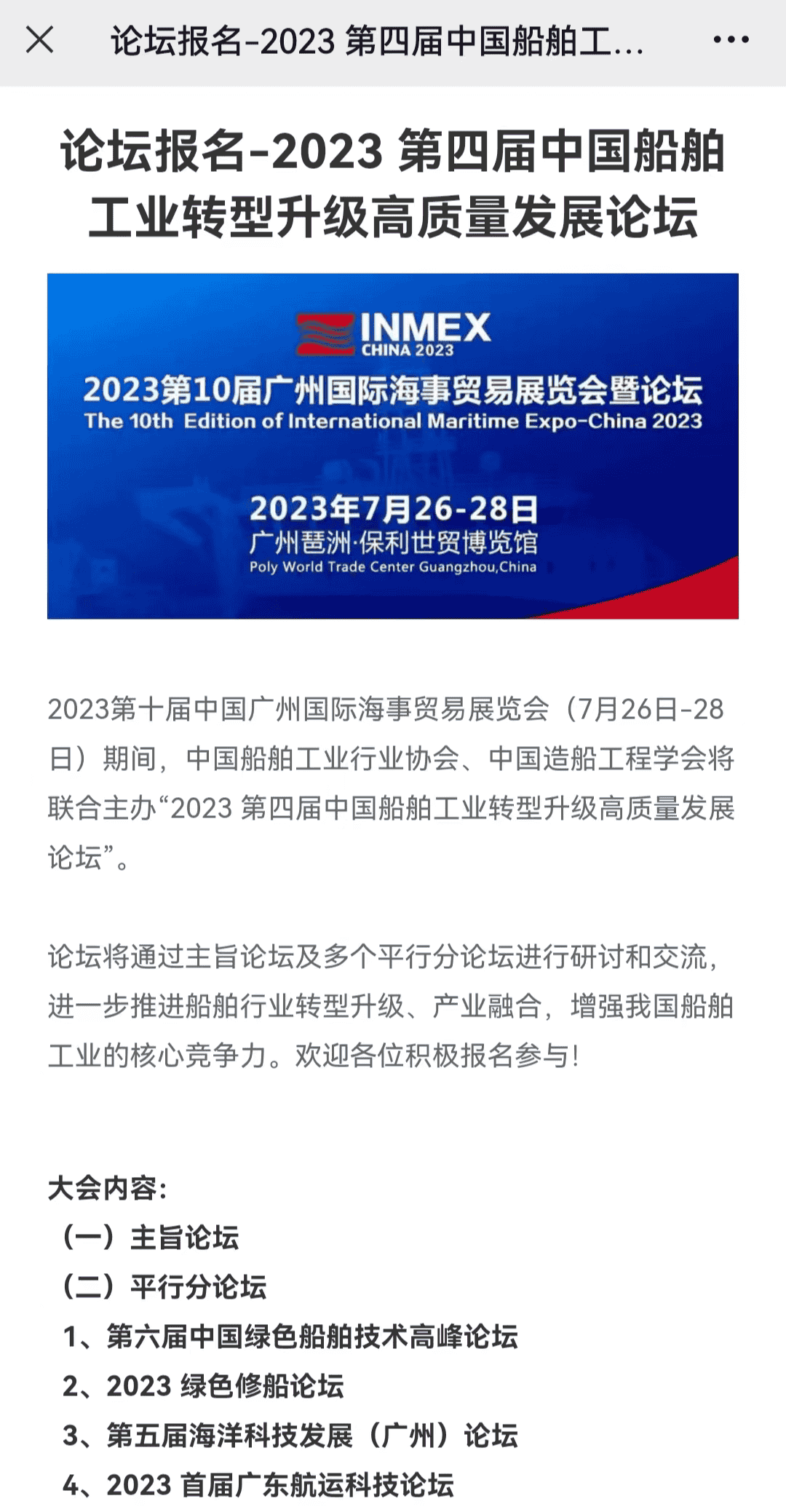 第十屆廣州國際海事展,同期召開“2023第四屆中國船舶工業(yè)轉(zhuǎn)型升級(jí)高質(zhì)量發(fā)展論壇”,論壇將通過主旨論壇及多個(gè)平行分論壇進(jìn)行研討和交流,進(jìn)一步推進(jìn)船舶行業(yè)轉(zhuǎn)型升級(jí)、產(chǎn)業(yè)融合,增強(qiáng)我國船舶工業(yè)的核心競(jìng)爭(zhēng)力。