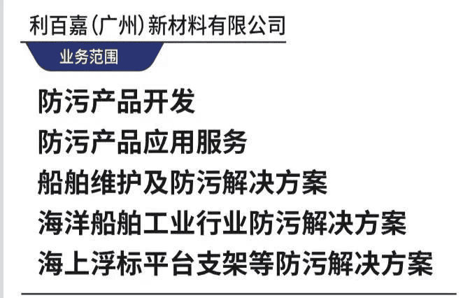 利百嘉(廣州)新材料科技有限公司(簡(jiǎn)稱:利百嘉),是領(lǐng)先的海洋防污新材料研發(fā)企業(yè),專注研發(fā)多功能環(huán)保新材料,為海洋環(huán)境保護(hù)提供技術(shù)服務(wù)和產(chǎn)品。