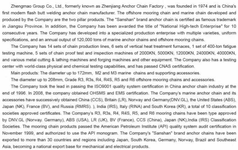 正茂集團(tuán)有限責(zé)任公司前身是鎮(zhèn)江錨鏈廠,始建于1974年,距離上海約2小時(shí)車程,是中國(guó)首家現(xiàn)代化的電焊錨鏈制造企業(yè)。