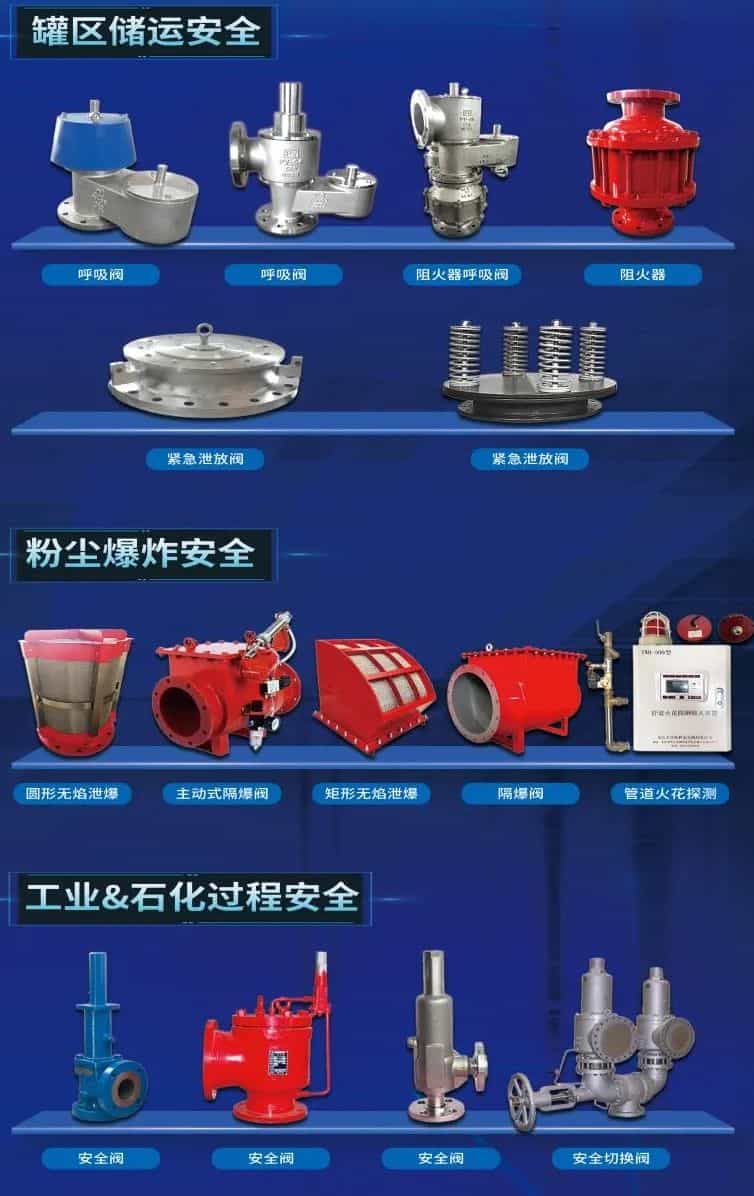 公司致力于壓力容器、鍋爐、常壓儲(chǔ)罐及壓力管道的保護(hù)研究,專業(yè)生產(chǎn)各類安全閥、呼吸閥、阻火器、緊急泄放閥、粉塵背壓隔爆閥、無火焰泄爆裝置、粉塵泄爆閥、火花探測(cè)熄滅裝置等工業(yè)爆炸及防護(hù)控爆產(chǎn)品。