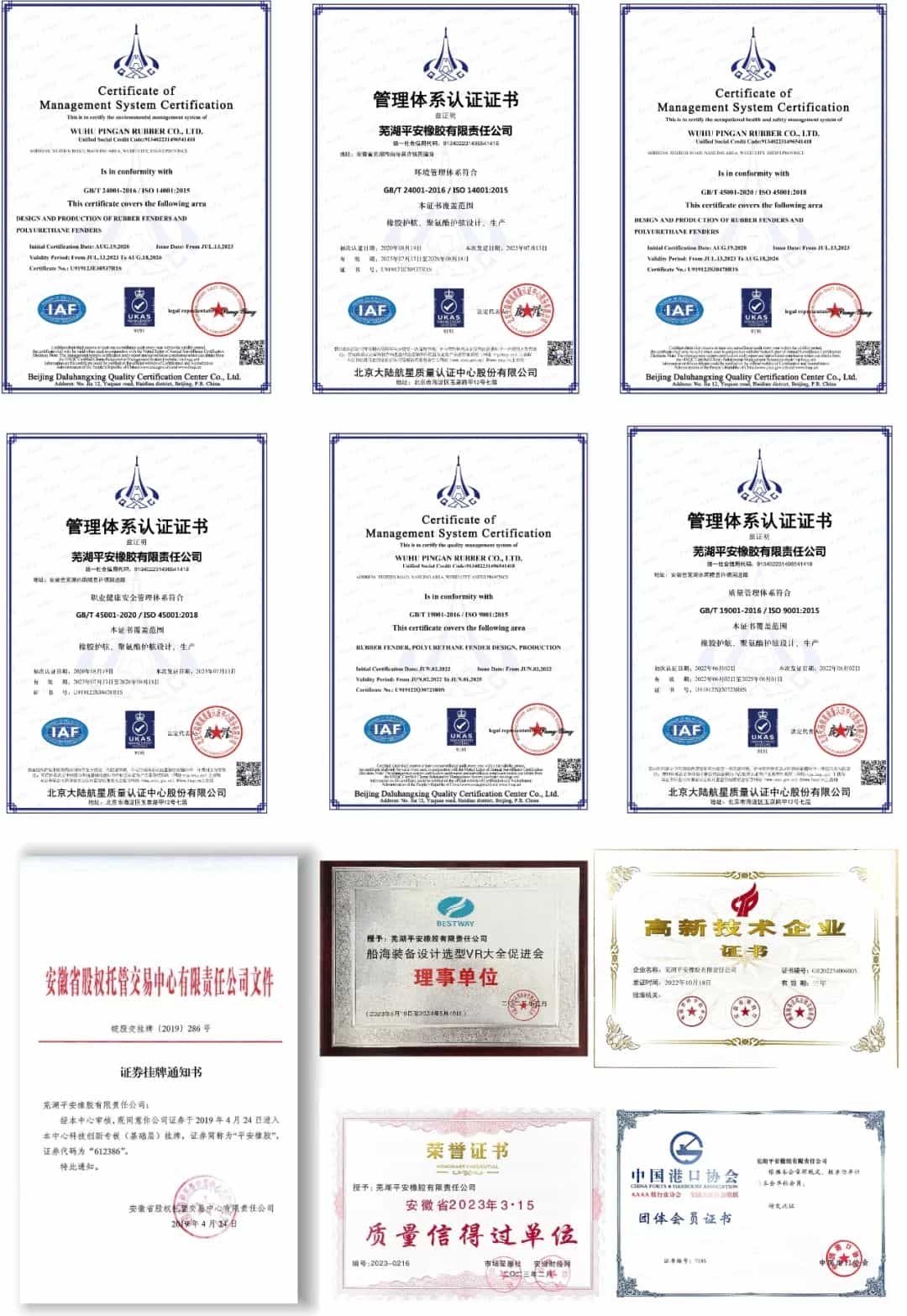 由研發(fā)部門設(shè)計的多款專利產(chǎn)品,如仿輪胎橡膠護舷、?;疑鹉z護舷,受到客戶一致好評。公司已通過ISO9001、ISO14001和OHSAS18001質(zhì)量管理體系認證,產(chǎn)品已獲得CCS、SGS檢驗認可,可提供CCS、 LR、BV船檢證書及軍檢證書。